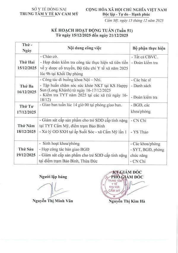 KẾ HOẠCH HOẠT ĐỘNG TUẦN 51 2025