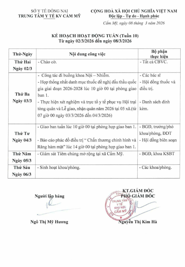 Kế hoạch hoạt động tuần 10 2026