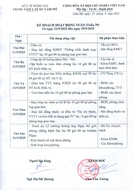 KẾ HOẠCH HOẠT ĐỘNG TUẦN 39 2025