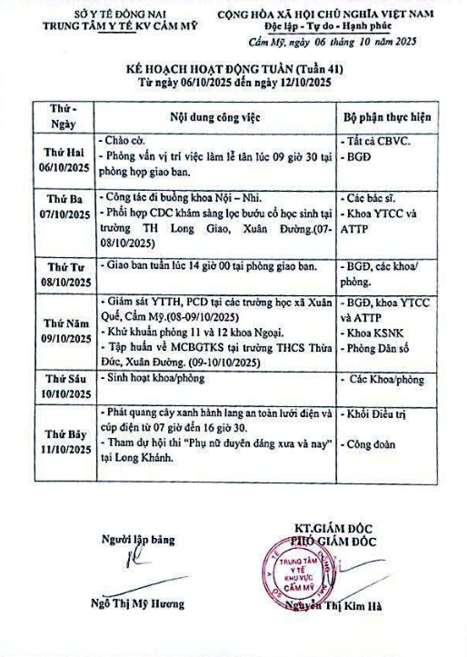 KẾ HOẠCH HOẠT ĐỘNG TUẦN 41 2025