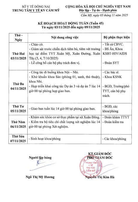 KẾ HOẠCH HOẠT ĐỘNG TUẦN 45 2025
