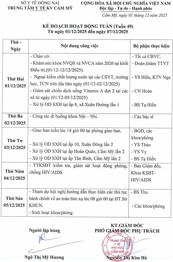 KẾ HOẠCH HOẠT ĐỘNG TUẦN 49 2025